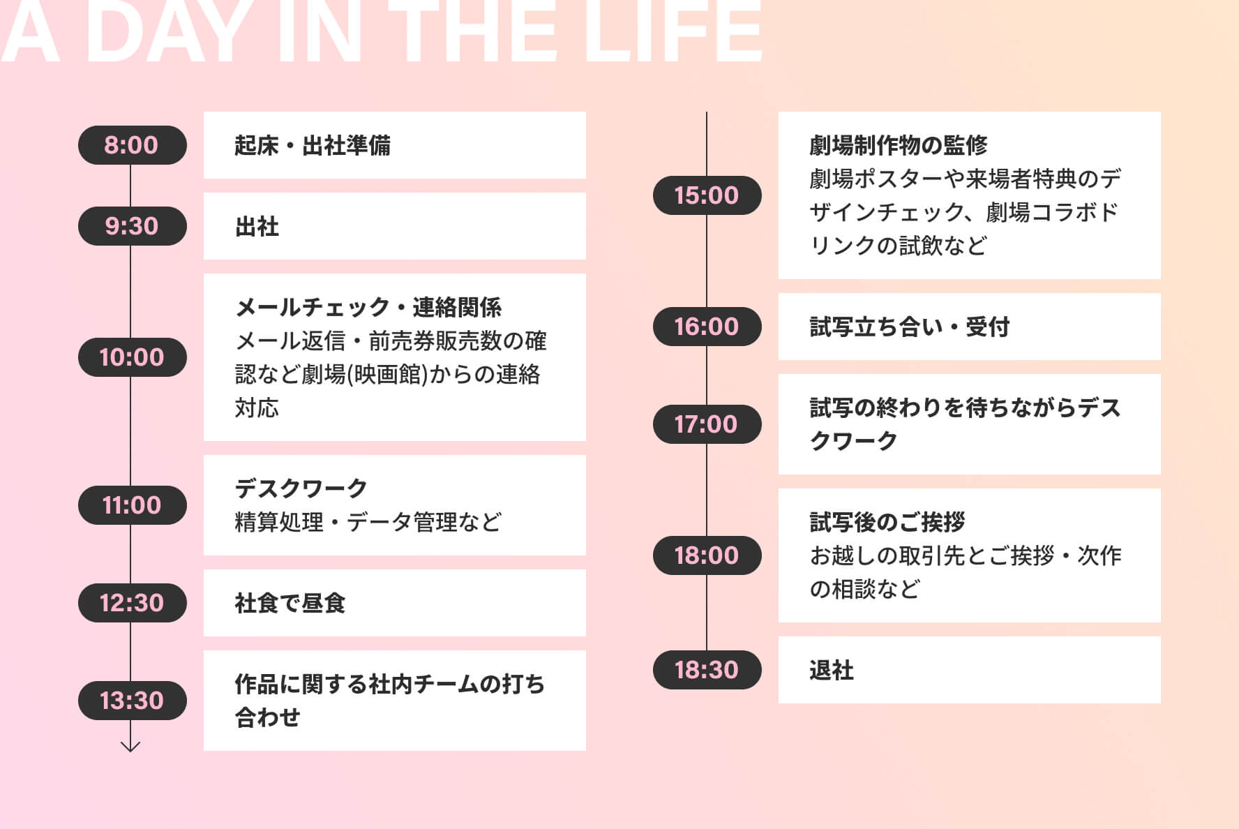 映画営業部はそれぞれが劇場の担当と作品の担当を持って、アニプレックス配給の映画作品を映画館で上映するセッティングをし、興行収入を売り上げるまで担う部署です。