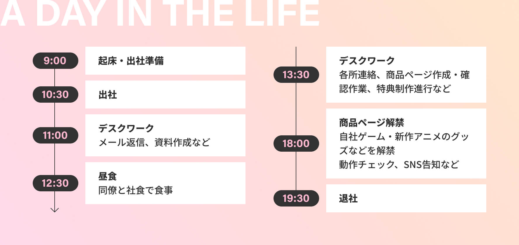 社内にはMD企画部があり、自社アニメ・ゲームの商品を企画開発しています。そのMD企画部が作った商品を販売するときに、サイト(アニプレックス オンライン)内に商品ページを作ったり、SNSを使って告知をしたりすることが私たちの主な仕事になります。