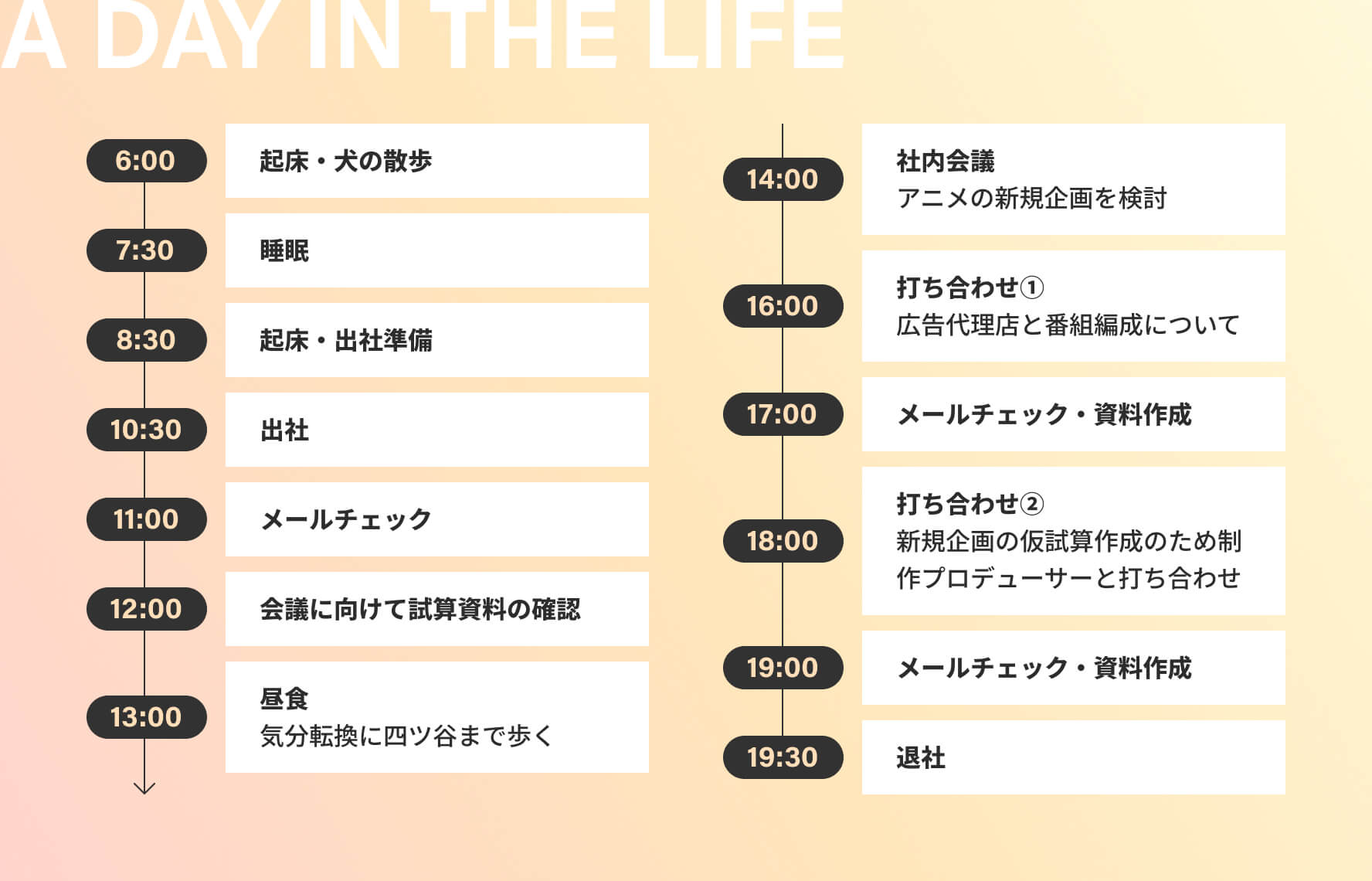 ほかにも、広告代理店や放送局との窓口として、番組の放送時期の管理や編成、CM進行等も私たちの部署で担当していて、納品スケジュールの調整などもこちらで引き受けることがあるのですが、作品の制作スケジュールに変更があった場合は広告代理店や放送局にもご相談をして、納品スケジュールを調整し直すこともあります。