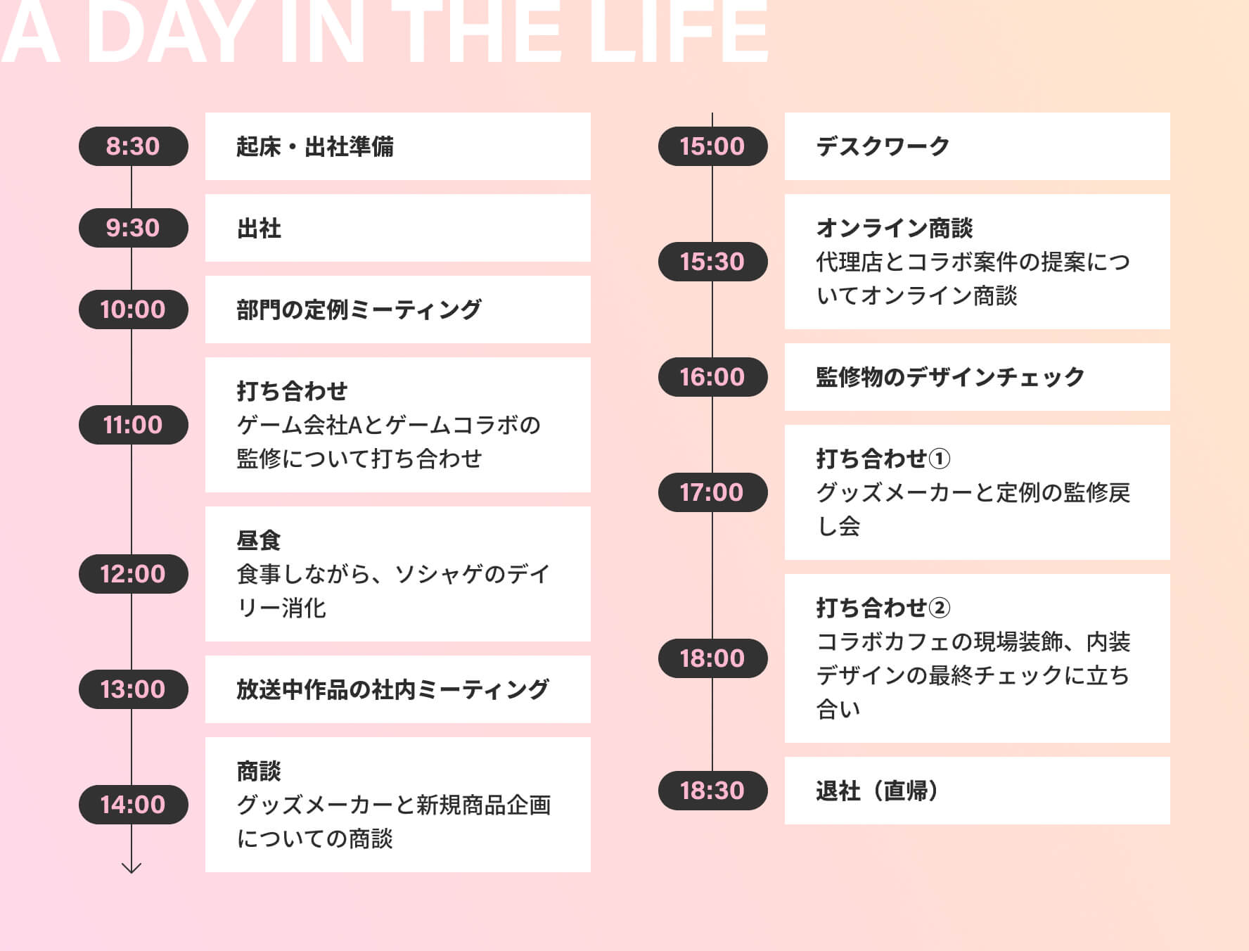 具体的な仕事としては作品の日本国内の商品化窓口として、グッズを作ってくださるメーカーや、作品の原作元やアニメ制作スタジオ、作品を手掛ける社内の制作メンバーと密に連絡をとっていくことになります。